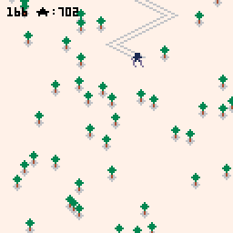 On the final day of the jam I knew I had one more game to make, but nothing was springing to mind. It was only when I saw Alexandre Rousseau post a gif of their entry Jammerboard and twitter that inspiration struck. Could I make a set of skis with forward and backward slashes? Could I also make a good looking set of trees with the ASCII characters available in Pico 8?